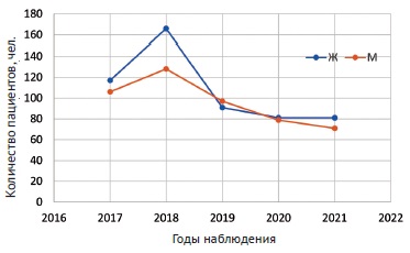 Рис. 6. Распределение переломов S82.1 среди мужчин и женщин в 2017–2021 гг.