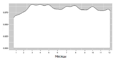 Анализ плотности распределения переломов S82.1 по месяцам позволяет заключить, что ее увеличение приходится на весенний и летний периоды (рис. 7).