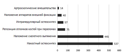 Экстренно были госпитализированы 1017 пациентов с переломами, оперированы 748 из них — выполнено 1752 операции. По неотложным и плановым показаниям в интервале 24–72 ч. с момента поступления у большинства пациентов выполнялась предоперационная подготовка скелетным вытяжением с последующим погружным остеосинтезом (рис. 8). Названия операций приведены в соответствии с классификатором[2].