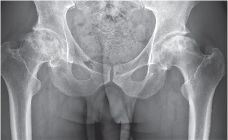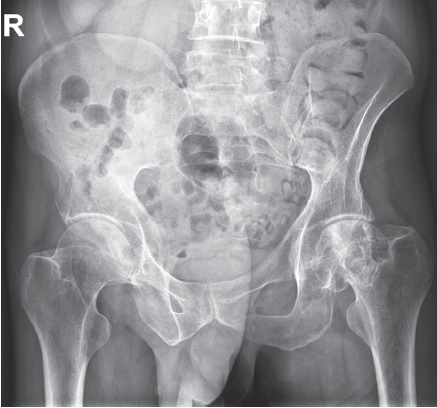 Fig. 5. Clinical case 2. X-ray in frontal projection — bilateral aseptic osteonecrosis of the femoral heads: right — stage 3B (late) according to ARCO
