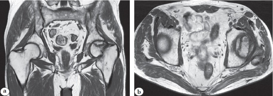 Fig. 2. Clinical case 1. MRI in frontal (a) and axial (b) projections: osteonecrosis of the left femoral head — stage 3B (late) according to the ARCO classification