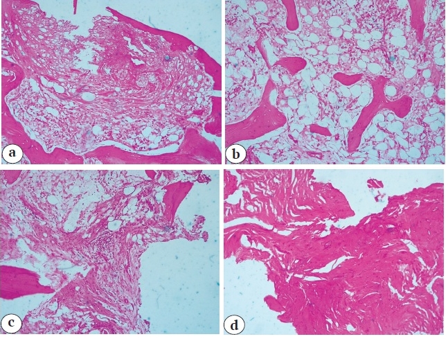 Fig. 3. Clinical case 1. Pathomorphological examination of the biopsy specimen: a — necrotic zone; b — lysis of bone trabeculae; c — focal infiltration; d — fibrosis zone. Hematoxylin and eosin staining. Mag. 100