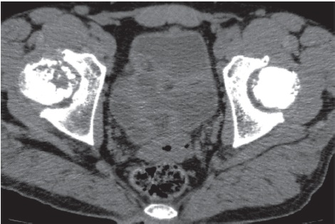 Fig. 4. Clinical case 2. CT scan of the pelvis, axial reconstruction — bilateral osteonecrosis of the femoral heads: right — stage 3B (late) according to ARCO, left — stage 3A (early) according to ARCO
