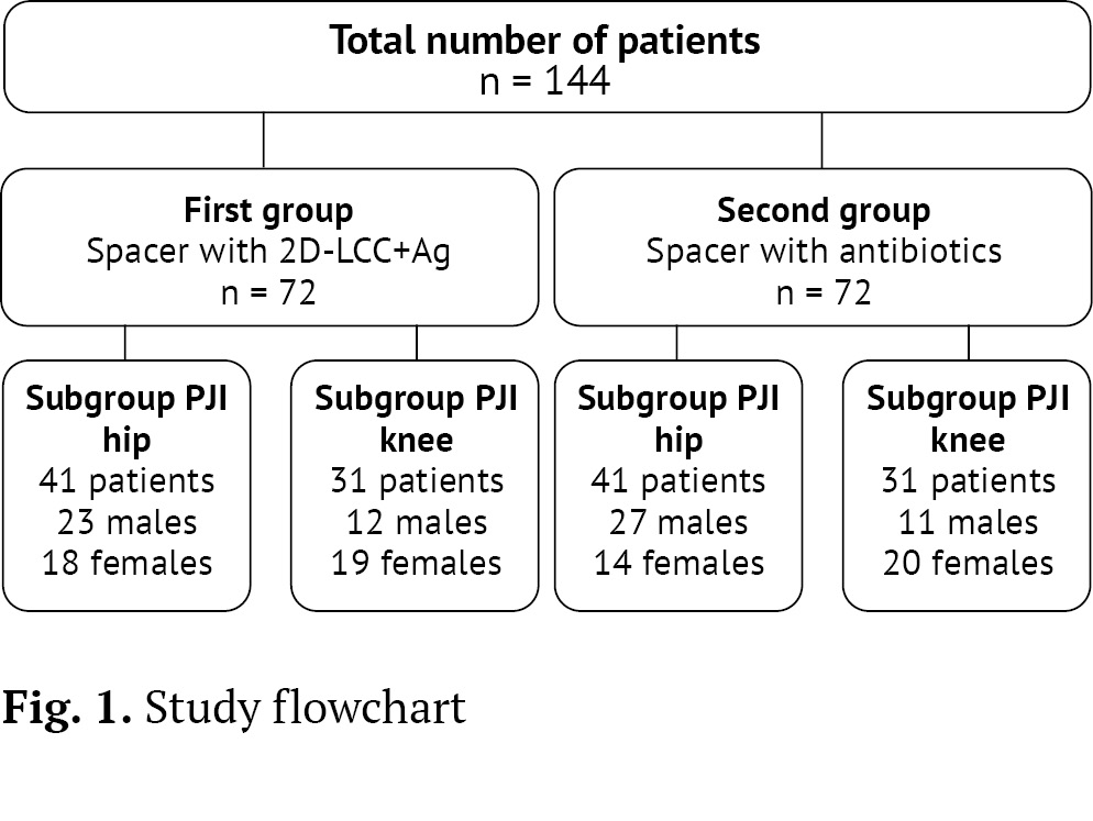 The aim of the study — to assess mid-term outcomes of knee and hip PJI treatment using spacers coated with two-dimensional linear carbon chains impregnated with silver.