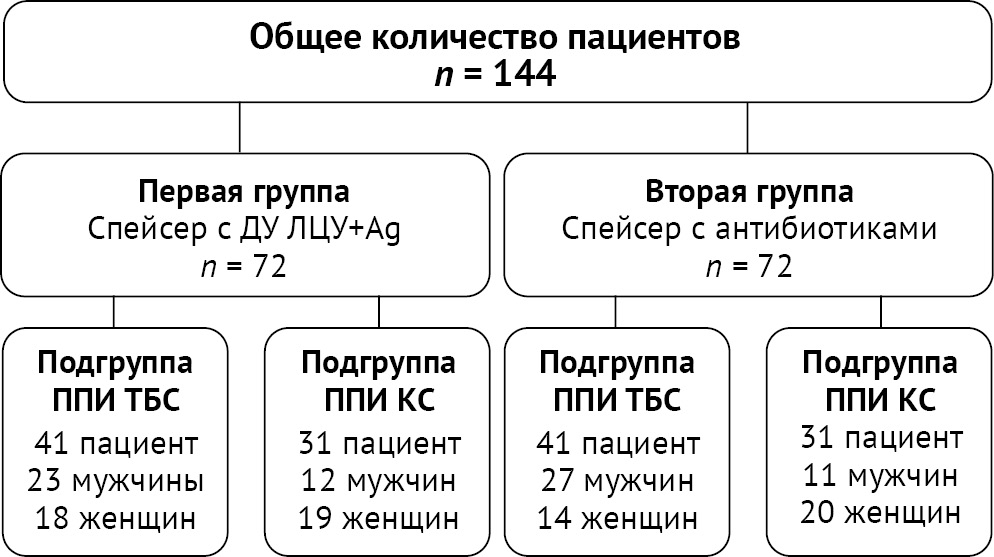 An open prospective cohort randomized study was conducted at the Center from 2017 to 2021. It was based on the results of examination and surgical treatment of patients with newly diagnosed periprosthetic joint infection (PJI) of the knee and hip joints.