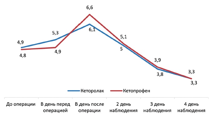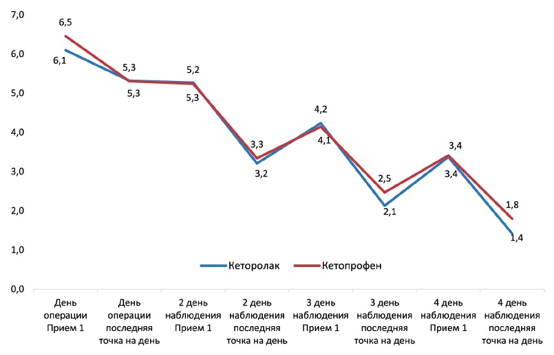 Средний, минимальный и максимальный уровни боли в течение дня как в покое, так и при движениях, а также продолжительность умеренной/сильной боли в течение дня значимо не отличались. Как кеторолак, так и кетопрофен позволяли эффективно контролировать уровень боли после ТЭКС: суточная динамика снижения боли представлена на рисунке 2.