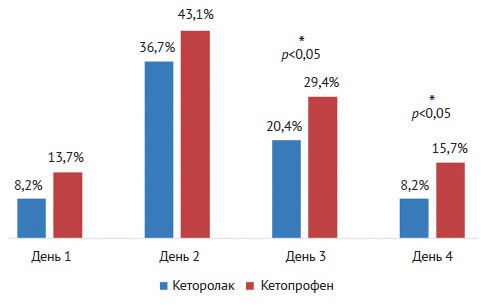 Оценка нежелательных эффектов и побочных действий проводилась с использованием оригинального опросника, составленного на основе побочных действий кеторолака*/кетопрофена**, которые описаны в утвержденных инструкциях к препаратам с пометками «часто» и «менее часто».