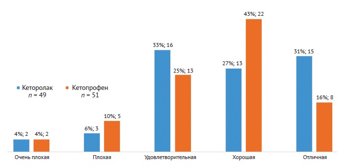 Более 2/3 пациентов отметили переносимость обоих препаратов как хорошую и отличную. Однако об отличном уровне удовлетворенности проводимым лечением среди пациентов, принимавших кеторолак, сообщило вдвое больше, чем среди получавших кетопрофен (рис. 7).
