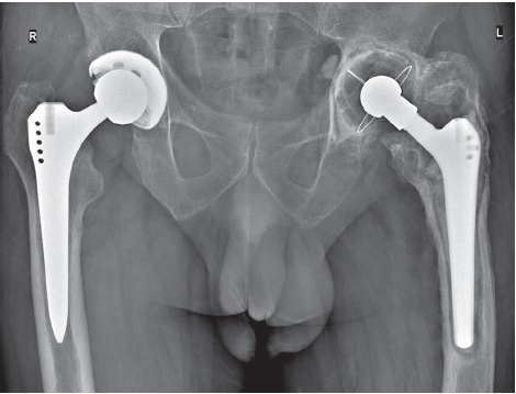 In the preoperative period, the left hip arthrocentesis was performed, followed by cytologic and microbiologic studies of synovial fluid aspirate. No data indicating the presence of infectious process in the joint were obtained.