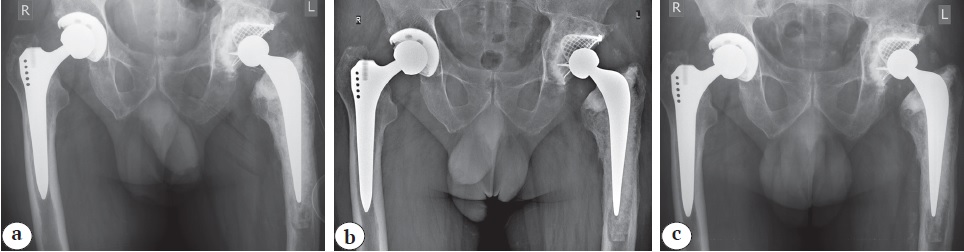 Fig. 3. Plain pelvis X-rays after the left hip revision: a — control X-ray immediately after the surgery (02/08/2018): even distribution of osteoplastic material, restoration of the center of rotation of the joint; b — 4 months after the surgery (24/12/2018): position of components remains unchanged, no migration of the acetabular and femoral components is observed, the state of osteoplastic material is satisfactory with no signs of resorption; radiolucent lines at the osteoplastic material-cement interface are absent; c — 4 years after the surgery (24/10/2022): X-ray signs of restructuring of osteoplastic material in the pelvic and femoral bones, radiolucent lines at the osteoplastic material-cement interface are absent, position of components remains unchanged with no signs of migration or subsidence