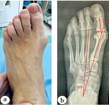 A case of a 48-year-old female patient with acquired deformity of the left forefoot is presented. At the time of preoperative examination, she complained of pain in the area of deformity. Complaints persisted for a year before the treatment. Load X-rays of the foot were performed (Fig. 2). To assess the degree of deformity correction, the first intermetatarsal angle and the first toe deviation angle were measured and resulted 13.5° and 25°, respectively.