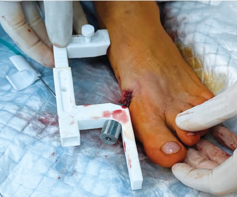 The patient is placed on the operating table in a supine position. The surgical field is treated with antiseptic solutions and delimited with sterile drape from the tips of toes of the operated foot to the upper third of the lower leg. Using a scalpel, the surgeon makes a 3-4 mm skin incision along the inner surface of the forefoot in the projection of the distal 1/4 of the diaphysis of the first metatarsal bone right up to the bone. The level of the osteotomy is located at a distance of approximately 2.0-2.5 cm from the radiological projection of the articular gap of the first metatarsophalangeal joint. Transverse osteotomy of the diaphysis of the first metatarsal bone is performed with a 2.2-2.9 mm burr. The head of the first metatarsal bone is displaced laterally. The intramedullary guide of the developed device is inserted into the medullary canal of the proximal fragment of the first metatarsal bone through the incision made earlier for osteotomy. The base of the guide is placed against the head of the first metatarsal bone, displacing it laterally and holding it in this position. The degree of outward displacement of the head is determined by the design of the guide and is not adjusted additionally. Depending on the individual features of the foot, the surgeon adjusts the position of the wire guide.