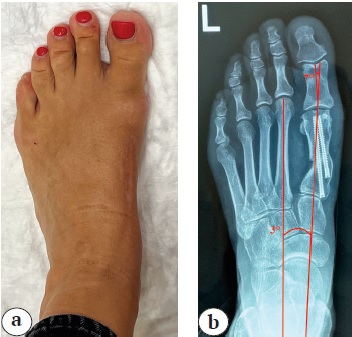 In the X-rays performed on the first day after the surgery, the first intermetatarsal angle was 3°, the valgus deviation angle of the first toe was 4°. The postoperative period was uneventful.